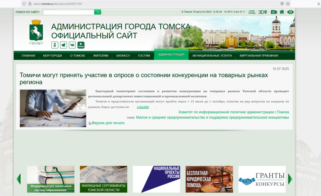 Департаментом инвестиционной и промышленной политики Томской области проводится мониторинг состояния и развития конкурентной среды на территории Томской области. По итогам данного исследования будет разработан перечень мероприятий для содействия развитию конкуренции на территории Томской области. Анкеты разработаны как для бизнеса, так и для населения. В связи с этим просим обеспечить прохождение анкетирования сотрудниками Ваших учреждений и подведомственных организаций по ссылке https://admin.tomsk.ru/db3/docs/2025071501.